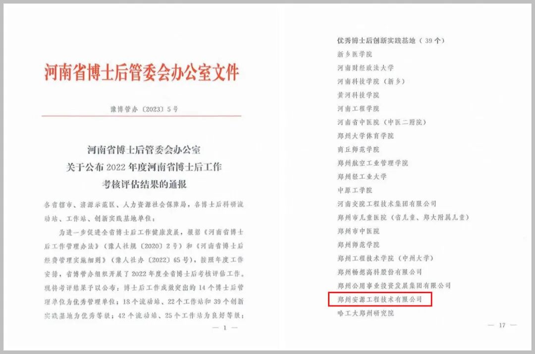 近日,河南省博士后管委会办公室印发了《关于公布2022年度河南省博士后工作考核评估结果的通报》(豫博管办〔2023〕5号),公布了2022年度全省博士后工作考核评估结果,郑州安源工程技术有限公司(以下简称“安源”)博士后创新实践基地获评“优秀”等级。